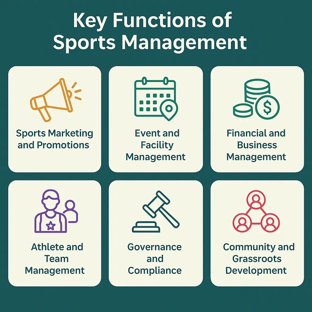 Sports management encompasses multiple functions, each contributing to the success of sports organizations and events: